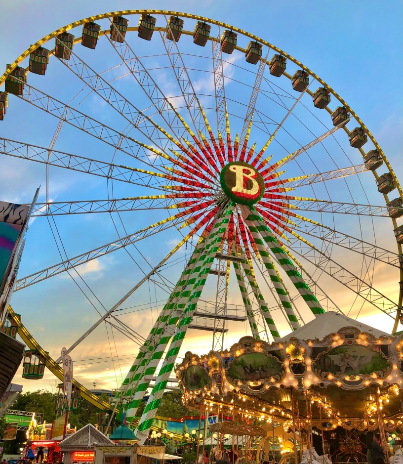 Eric wollte unbedingt ins Riesenrad, weil man da so einen schönen Ausblick auf die Altstadt hat. Ich mache mir sonst gar nichts aus Fahrgeschäften, weil mir beim kleinsten Schaukeln oder Drehen schwindelig wird.