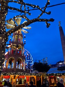 Genau die richtige Frage – ich hatte nämlich den ganzen Tag nur ein halbes Käsebrötchen verdrückt und sehnte mich nach einem anständigen Abendessen. Und Weihnachtsmarkt ist sowieso immer eine gute Idee.